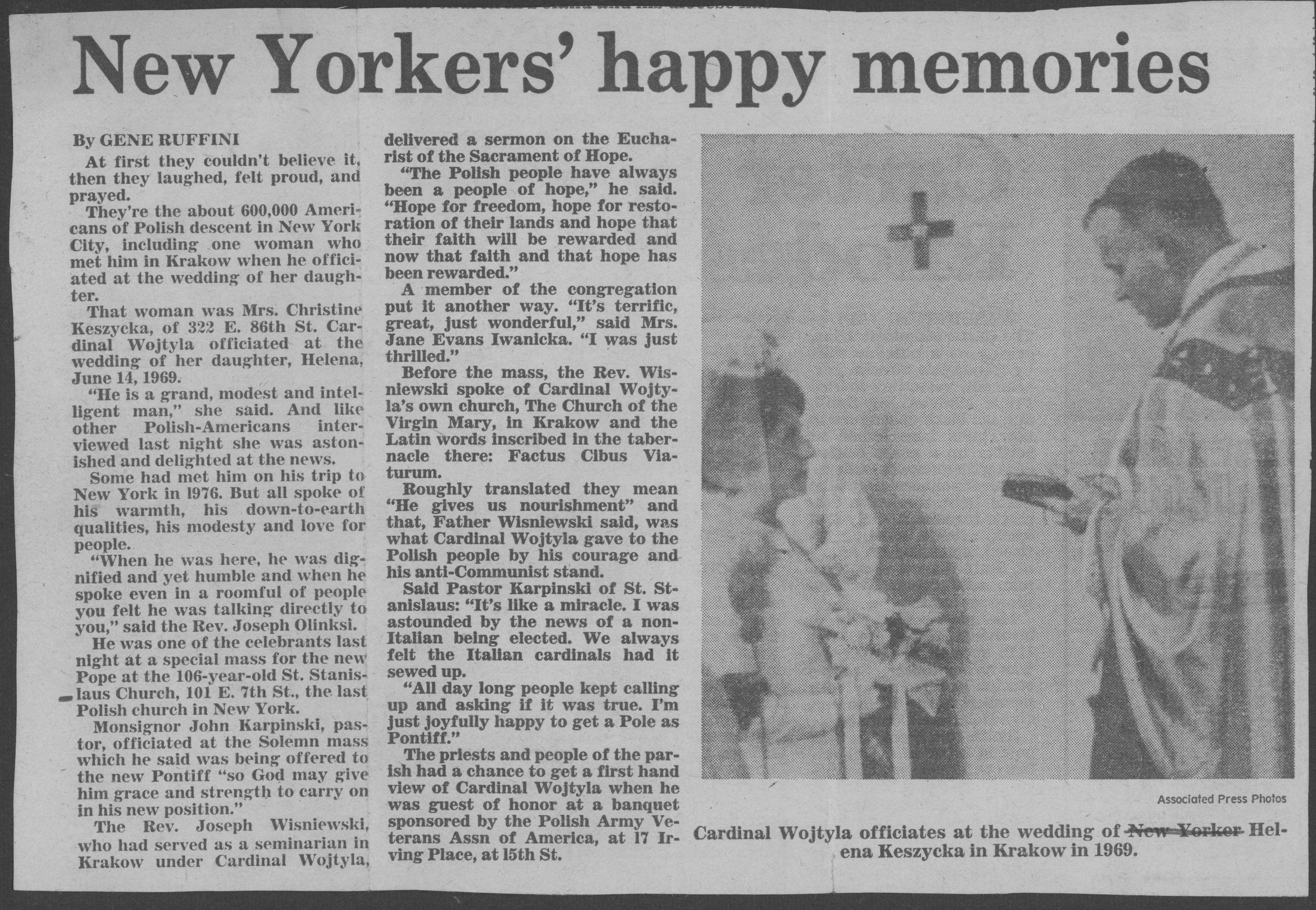 New York newspaper featuring Krystyna Kęszycka’s daughter, Helena, standing before Cardinal Wojtyla on her wedding day.