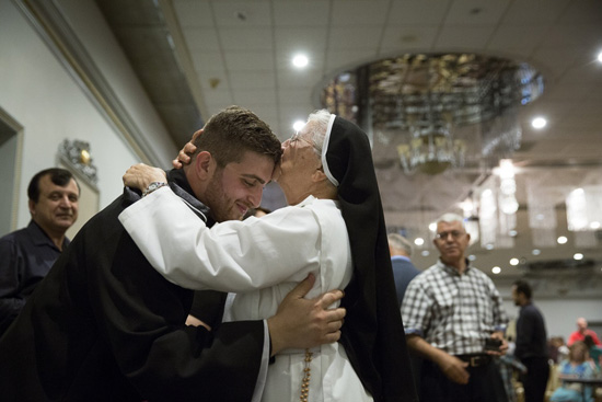 Newly ordained, Fr. David Stephen receives a kiss from his aunt during a reception at Saint Peter Chaldean Cathedral in El Cajon. A Dominican Sister of Saint Catherine of Siena, she travelled from Iraq to be with the family for his ordination.
